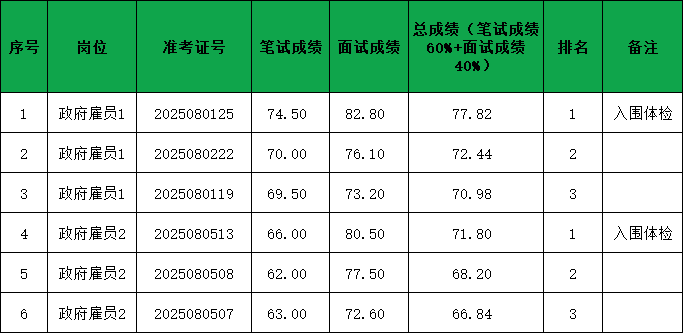 根據(jù)《揭陽(yáng)市揭東區(qū)統(tǒng)計(jì)局2025年公開(kāi)招聘政府雇員公告》,經(jīng)發(fā)布公告、組織報(bào)名、資格審查、組織筆試和面試,現(xiàn)將考試成績(jī)和入圍名單公示如下: